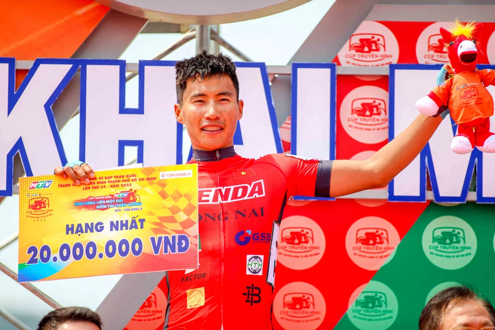 Tay đua đội Kenda Đồng Nai nhận giải thưởng chiến thắng chặng tại Hạ Long. ẢNH: PHẠM HUY