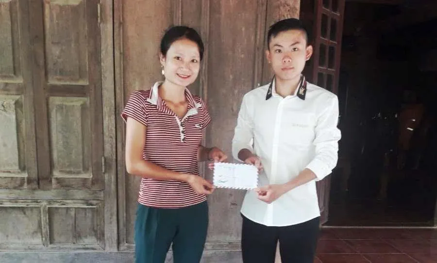 Chị Vi Thị Nguyệt, Bí thư Đoàn Thanh niên xã Tà Cạ, biểu dương, khen thưởng em Lương Thế Mạnh.