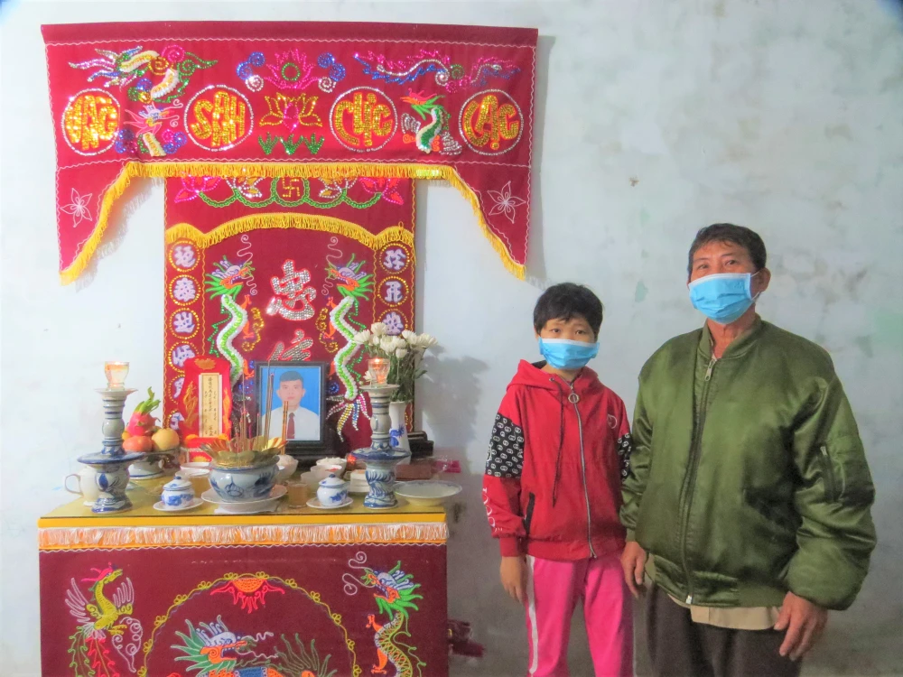 Ông Lê Thanh Nhâm và em Lê Hoài Ân (bị bệnh tan máu bẩm sinh, động kinh) bên bàn thờ Lê Công Hậu.