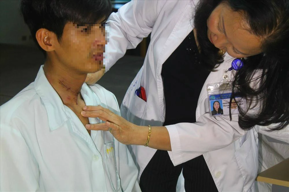 Cách đây hai năm, chàng trai đi làm ở Campuchia chạy xe máy ngang công trường có căng dây vào buổi tối, do không nhìn thấy nên bệnh nhân bị sợi dây cắt ngang cổ.