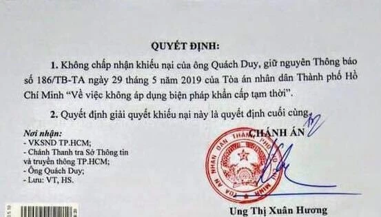 Từ đó, toà không chấp nhận khiếu nại của ông Duy giữ nguyên thông báo về việc không không áp dụng biện pháp khẩn cấp tạm thời. Quyết định giải quyết khiếu nại này là quyết định cuối cùng.