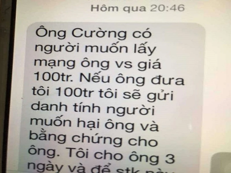 Theo đó, vào ngày 15-10, ông nhận được một tin nhắn từ số điện thoại +849013... với nội dung có người muốn lấy mạng ông với giá 100 triệu đồng. Nếu chấp thuận, ông Cường sẽ rõ danh người đó cũng như những bằng chứng liên quan. Tin nhắn này còn để lại số tài khoản ngân hàng để ông Cường chuyển tiền.