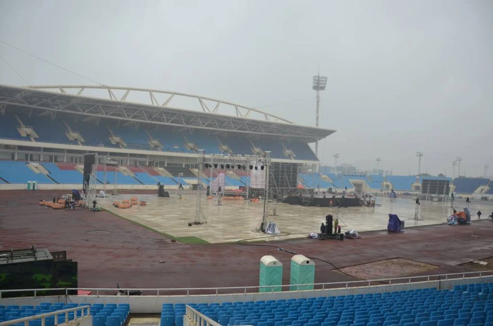 Những công đoạn cuối cùng để lắp các màn hình LED phục vụ miễn phí người hâm mộ xem trực tiếp trận đấu đang được gấp rút hoàn thiện.