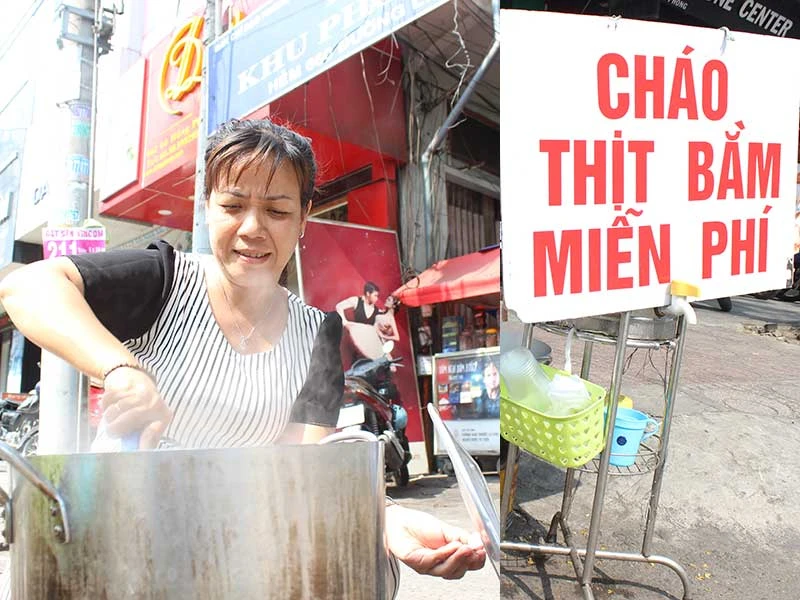 Đều đặn 14 giờ mỗi ngày, người đi đường có thể nhìn thấy hình ảnh một người phụ nữ còn khá trẻ tuổi ngồi lụi cụi bên cạnh nồi cháo còn đang bốc khói nghi ngút ngay đầu con hẻm, bên cạnh là tấm bảng với dòng chữ màu đỏ “Cháo thịt bằm miễn phí”.