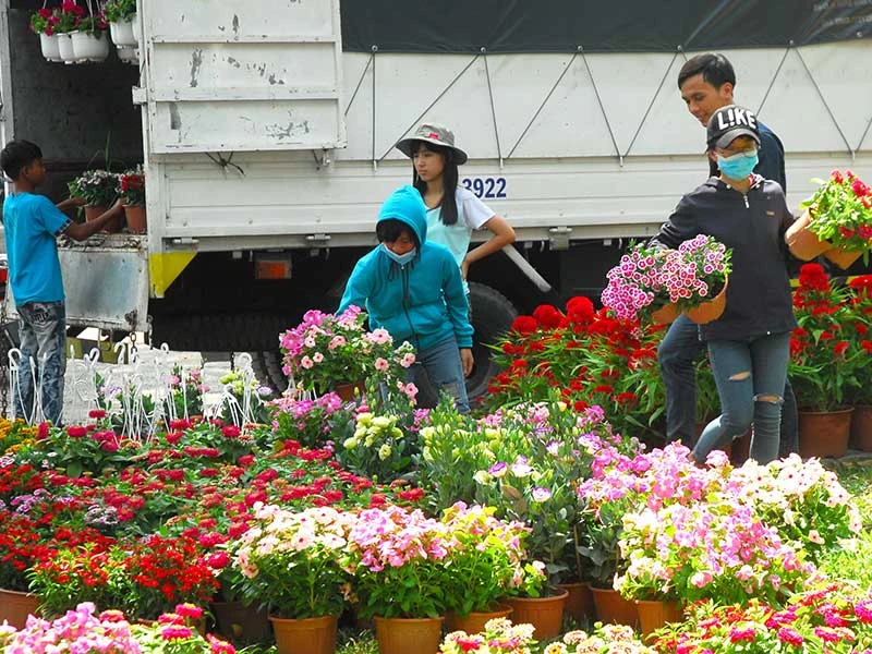 Các sinh viên phụ bán hoa để tìm thêm thu nhập tại TP.HCM. Ảnh: HTD