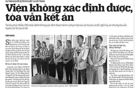 12 cây tràm này trung tâm đã thu hồi, đã bán và lấy lại đúng bằng số tiền thiệt hại mà cơ quan tố tụng đã quy kết. Trung tâm nói không còn thiệt hại nữa, đại diện VKSND tỉnh Đồng Nai cũng nói không xác định được hành vi phạm tội của các bị cáo nên đề nghị tòa hủy án để yêu cầu điều tra lại. Nhưng HĐXX TAND tỉnh Đồng Nai vẫn tuyên y án sơ thẩm kết tội tám bị cáo (trong đó có năm bị cáo từng bị tạm giam, tòa tuyên phạt tù đúng bằng số ngày tạm giam này).