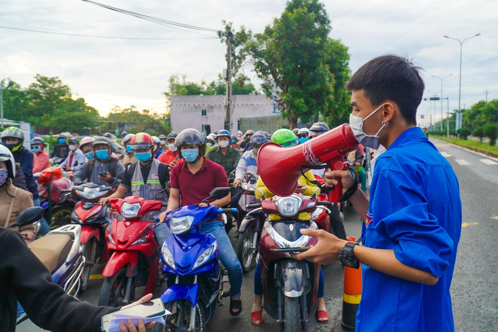 Đoàn viên thanh niên phát loa hướng dẫn người dân. Ảnh: BT
