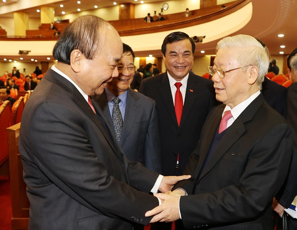 Tổng Bí thư, Chủ tịch nước Nguyễn Phú Trọng và Thủ tướng Nguyễn Xuân Phúc dự bế mạc Hội nghị Trung ương 14. Ảnh: TTXVN