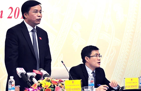 Chủ nhiệm Văn phòng QH Nguyễn Hạnh Phúc trả lời báo chí tại cuộc họp báo thông tin về kỳ họp thứ 10, QH khóa XIII sáng 19-10. Ảnh: TRỌNG PHÚ