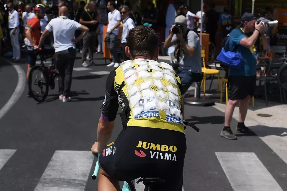Một tay đua của đội đua xe đạp Hà Lan Jumbo-Visma mặc một chiếc yếm bằng nhựa đặc biệt với nhiều túi chứa đầy băng trong cuộc đua xe đạp Tour de France vào ngày 23-7-2019. Ảnh: AFP