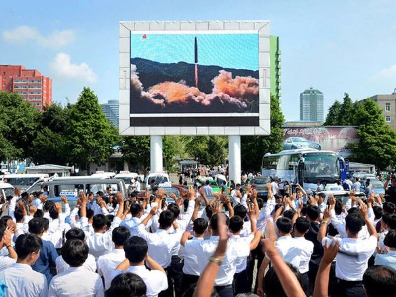 Hình ảnh của hãng thông tấn trung ương Triều Tiên KCNA công bố ngày 5-7-2017 cho thấy người dân nước này đang xem tường thuật vụ phóng tên lửa đạn đạo xuyên lục địa Hwasong-14 của Bình Nhưỡng. Ảnh: KCNA