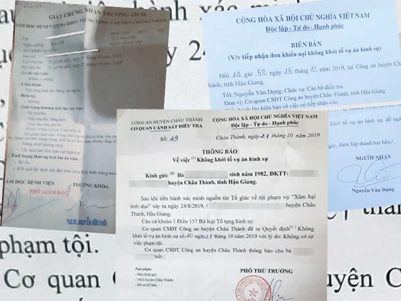 Thông báo không khởi tố vụ án hình sự của công an, giấy chứng nhận thương tích của bệnh viện cùng biên bản tiếp nhận đơn khiếu nại của công an. Ảnh: CHÂU ANH