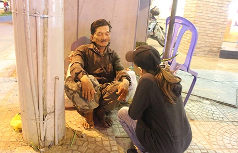 Người phụ nữ ấy là Nguyễn Mai Châu. Chị Châu gặp người đàn ông này ngồi ở góc đường hơn một tuần trước trong lúc đi tập thể dục về ngang qua. Người đàn ông, mặc dù chẳng còn nhớ tên mình, tâm trí đã trở nên ngơ ngẩn, chộp ăn lấy ăn để hộp cơm. Suốt tháng qua, tối nào chị cũng dặn ông về đây để chị mua cơm cho ăn rồi nhờ chúng tôi liên hệ để đưa ông vào cơ sở bảo trợ của Nhà nước.