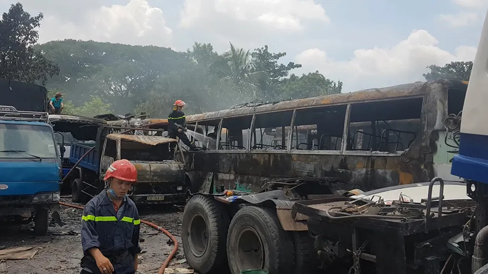 (PLO)- Lửa bùng phát dữ dội từ bãi xe nằm trên quốc lộ 1 (huyện Bình Chánh, TP.HCM), nhiều chiếc xe đã bị thiêu rụi.