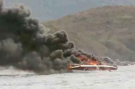 Chiếc ca nô bốc cháy dữ dội trên vịnh Nha Trang.