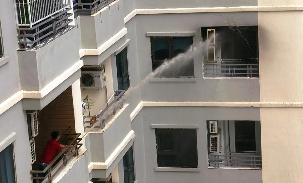 Mọi người buộc phải đứng ở ban công nhà bên cạnh dùng vòi nước xịt vào đám cháy nhưng không thể dập tắt lửa. Lúc này, khói và mùi khét ám khắp nơi, nhiều người trong chung cư lập tức tháo chạy xuống đất thoát thân.