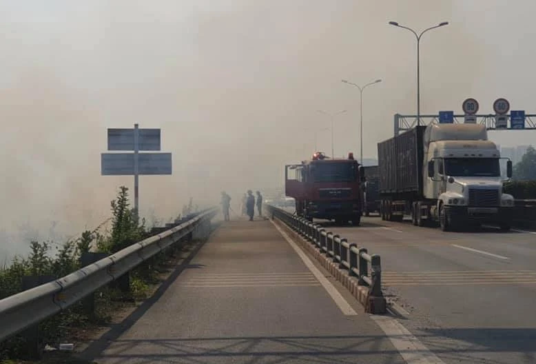 Cháy cỏ khiến khói mù mịt đường dẫn cao tốc. Ảnh: NDCC