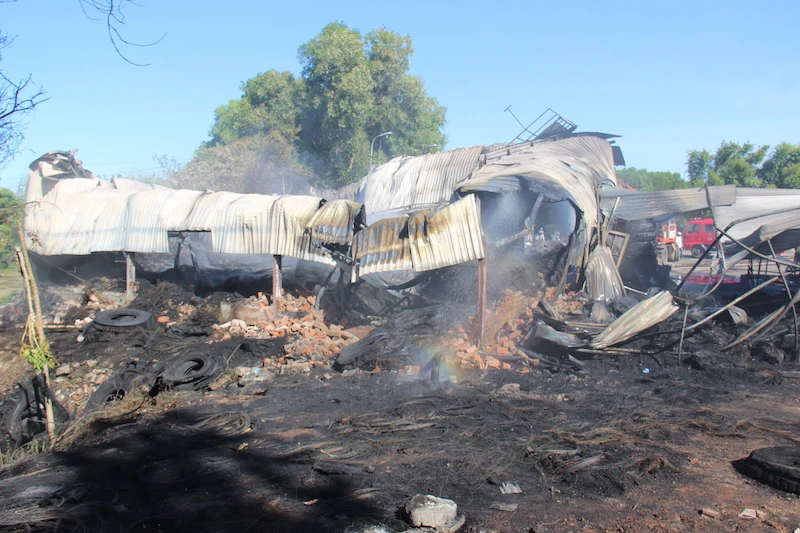 Vụ cháy khiến nhiều vật dụng bên trong cơ sở lốp ô tô bị thiêu rụi. Ảnh: TN