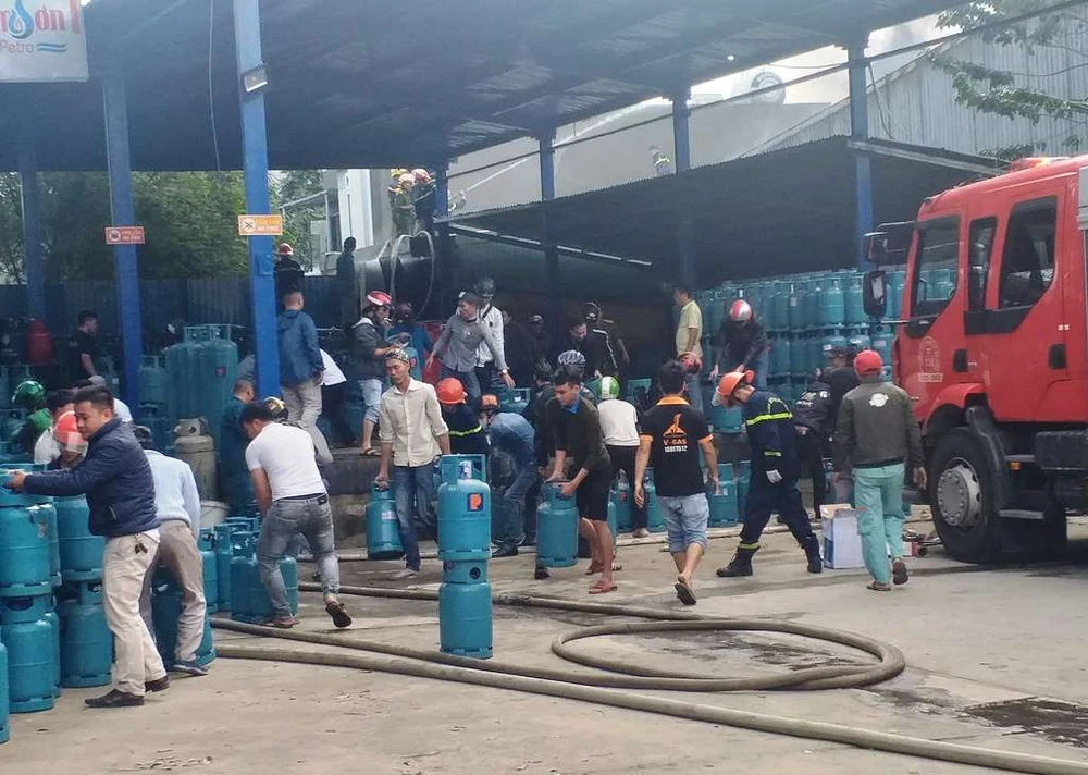 Bên cạnh công ty gỗ này là kho chứa hàng ngàn bình gas. Lo sợ ngọn lửa cháy lan nên mọi người huy động di chuyển các bình gas ra xa khu vực hỏa hoạn.
