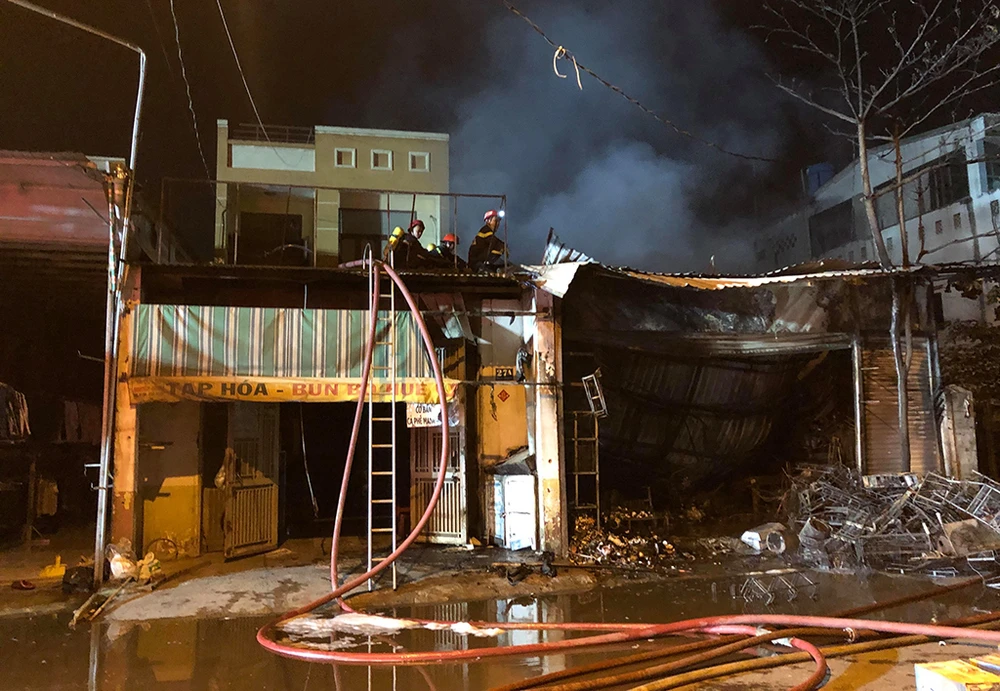 Đến hơn 23 giờ, cảnh sát PCCC vẫn đang tiếp tục phun nước để chống cháy lan, đồng thời lấy lời khai những người liên quan để xác định nguyên nhân và thiệt hại do cháy gây ra.