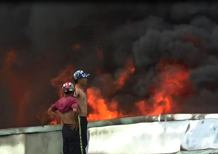 Hiện hàng trăm người dân đang nháo nhào lo lắng đám cháy mỗi lúc một lớn. Lửa vẫn bao trùm toàn bộ công ty đe dọa những căn nhà kế bên.
