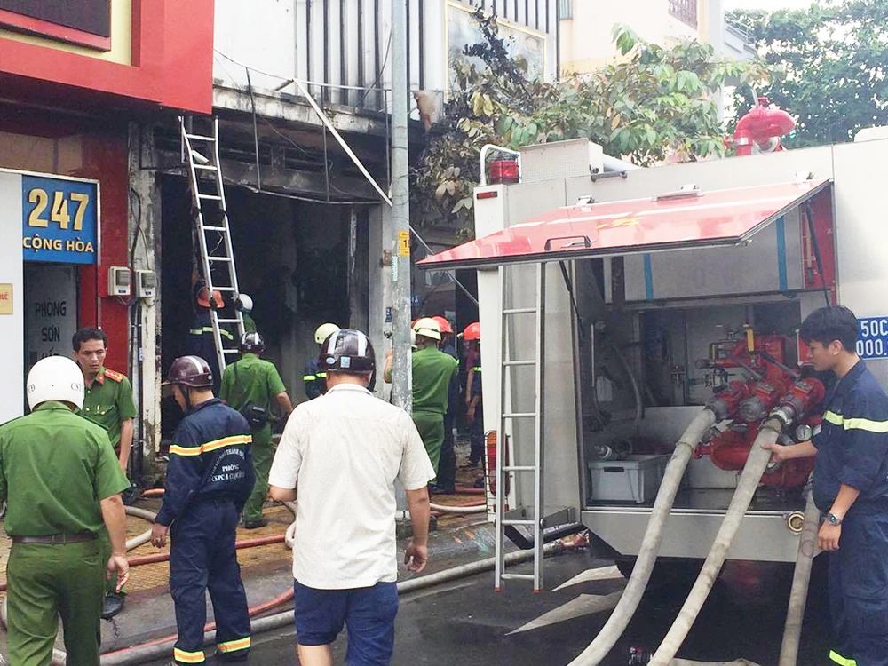 Hỏa hoạn bùng phát từ căn nhà đồng thời là nơi kinh doanh sơn, hóa chất trên đường Cộng Hòa khiến ba người thương vong. Ảnh: H.TÂM