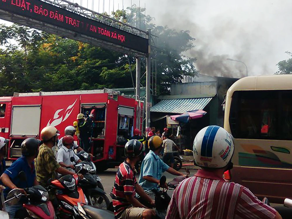 Khói đen bốc lên dữ dội lan ra xung quanh khiến người dân nhốn nháo, nhiều phương tiện lưu thông trên đường cũng dừng lại khiến giao thông ùn ứ cục bộ.