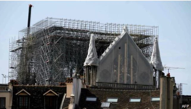 Hệ thống giàn giáo và cột trụ được lắp đặt để bảo vệ những phần còn lại của nhà thờ. Ảnh: AFP