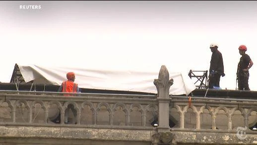 Các kỹ sư và nhà leo núi tiến hành phủ bạt che chắn nhà thờ. Ảnh: REUTERS