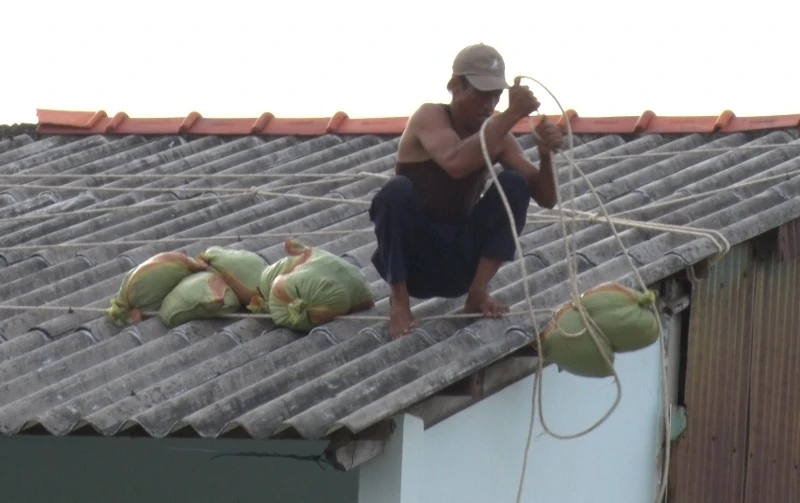 Dùng bao cát để dằn mái tôn chống bão ở Trần Đề