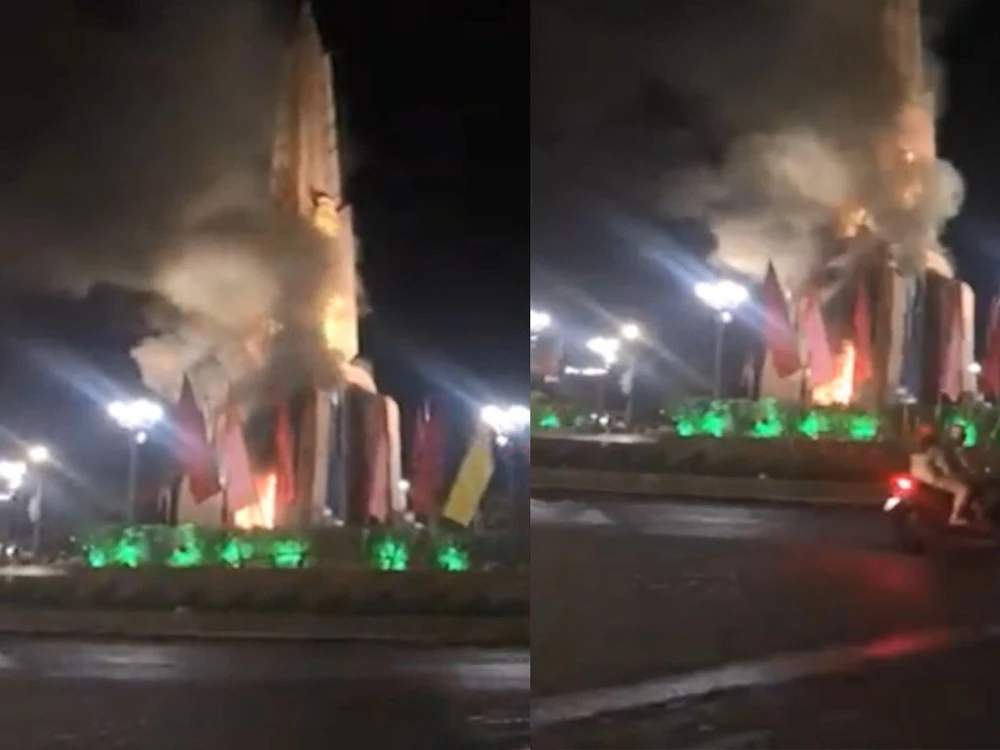 Cảnh cháy dưới chân tượng đài Cà Mau (ảnh cắt từ clip trên mạng xã hội).