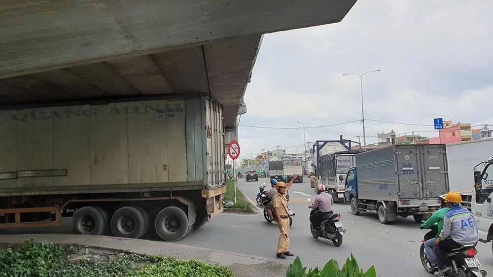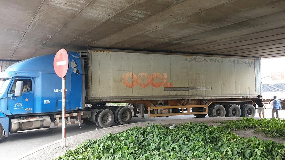 Khi đến cầu vượt An Sương (quận 12, TP.HCM), thay vì chạy về hướng đường Trường Chinh để ôm cua thì tài xế cho phương tiện rẽ trái ngay dưới gầm cầu đoạn dành cho xe hai bánh, xe tải dưới 3,5 tấn và mắc kẹt do độ cao không cho phép.