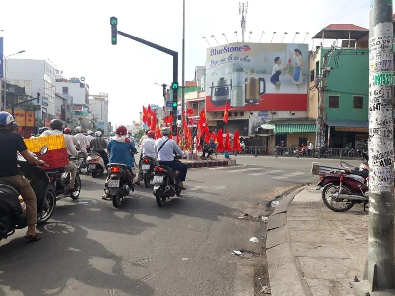 Người dân bán cờ tại đường Hòa Bình, quận Tân Phú.