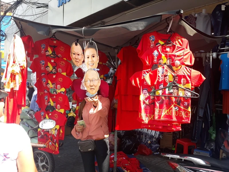 Dọc các con đường, áo thun in hình đội tuyển Việt Nam, quốc kỳ, băng rôn, áo đỏ sao vàng được bày bán. Đặc biệt, áo in hình đội tuyển Việt Nam được rất nhiều người mua, có một số nơi không còn áo để bán.