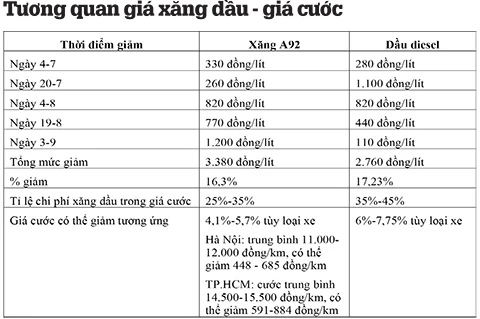Cũng theo vị này, một số hãng xe taxi (như Vinataxi) đã tăng cước 500 đồng/km thì nay đã giảm giá cùng giá tăng ấy và xem như về lại giá cước ban đầu (trong khi giá xăng cao hơn). Với DN chưa giảm, như hãng xe taxi Mai Linh từng tăng 500 đồng/km thì Sở Tài chính đã nhắc và hãng xe này cũng cam kết sẽ giảm cước taxi trước ngày 10-9. Vị này nói thêm: “Tháng 1-2015 đã có nhiều đoàn kiểm tra của các bộ, các cục về giá xăng dầu, giá cước vận tải và có kết luận chúng tương xứng nhau. Những DN nào chưa giảm tương xứng đều bị yêu cầu điều chỉnh lại cho phù hợp. Hiện Sở Tài chính đang phối hợp theo dõi sát sao và khi có đủ cơ sở sẽ yêu cầu DN điều chỉnh giá cho phù hợp”.