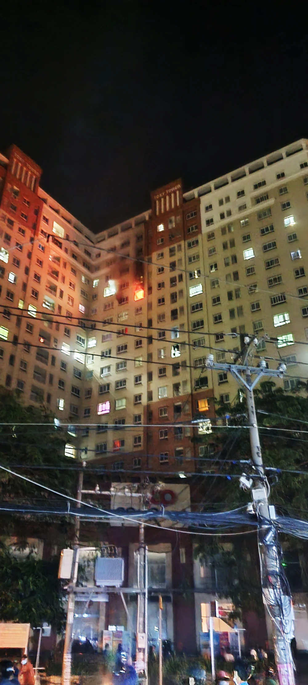 Trong khi cháy, các căn hộ cận đó vẫn sáng đèn. Ảnh: NT
