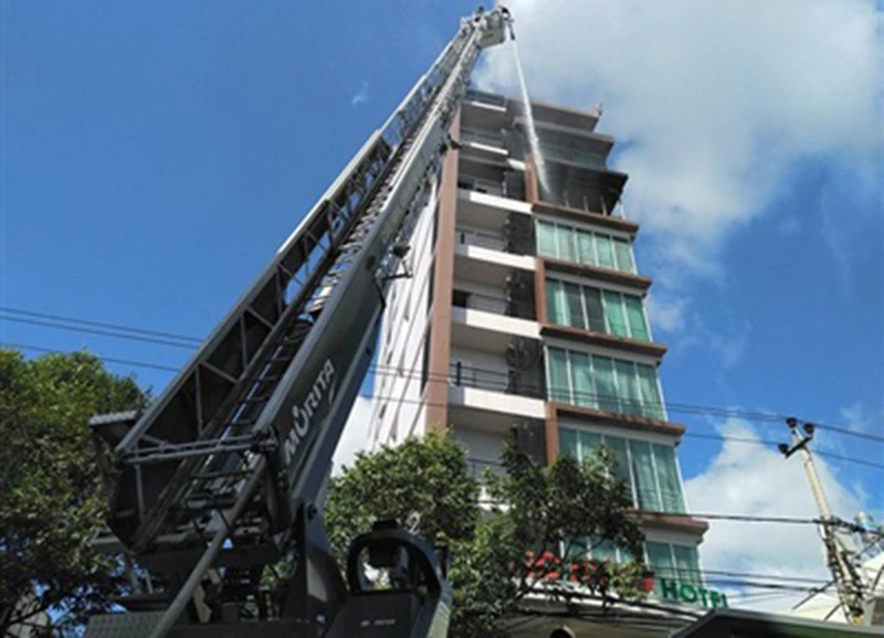 Xe thang đưa nước lên dập lửa ở tầng tám.
