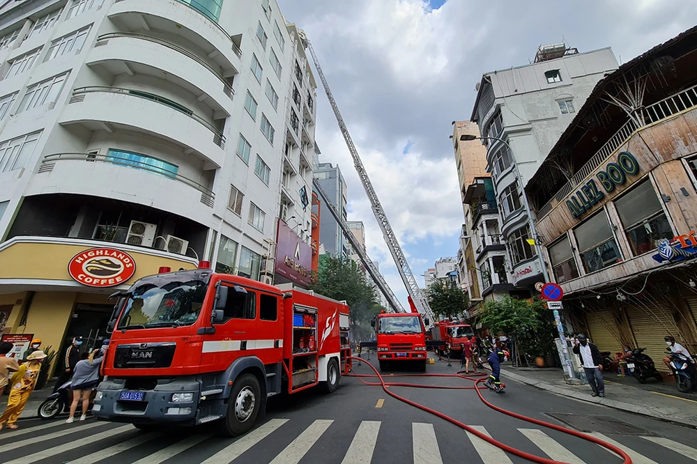 Cảnh sát PCCC quận 1 phối hợp cùng Phòng Cảnh sát PCCC điều nhiều phương tiện gồm cả xe thang cùng hàng chục cán bộ chiến sĩ đến hiện trường triển khai công tác cứu người, dập lửa.