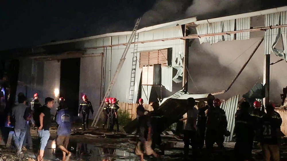 Cảnh sát mang mặt nạ phòng độc tiếp cận nhiều hướng phá mái tôn, tường để tiếp cận phun nước tại điểm hỏa. Nhiều máy bơm được huy động để hút nước tại các nguồn xung quanh kho hàng phục vụ dập lửa.
