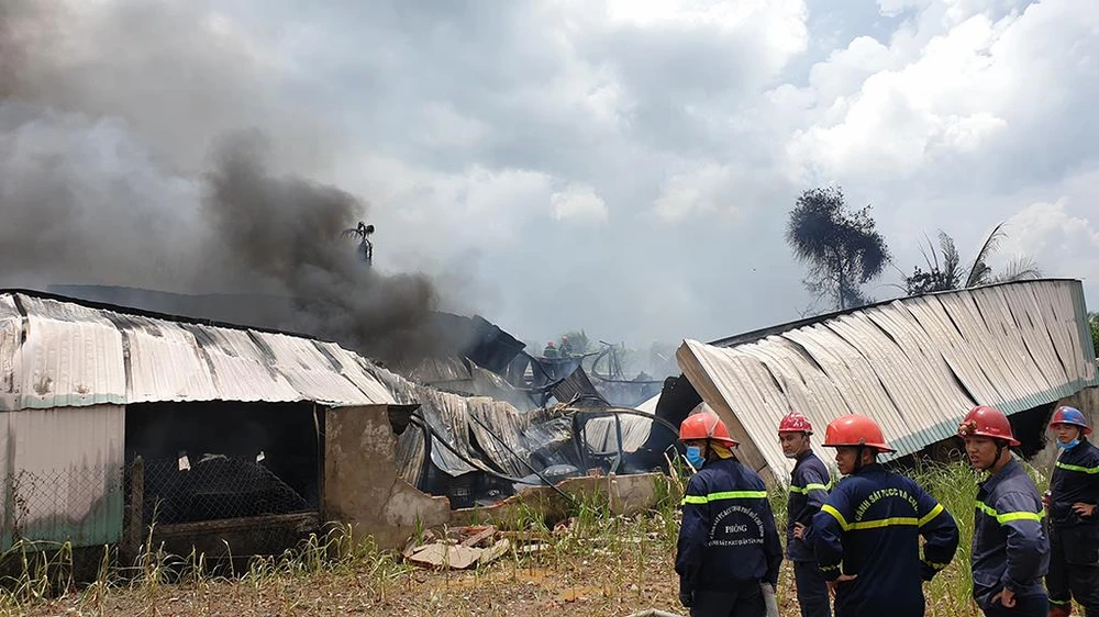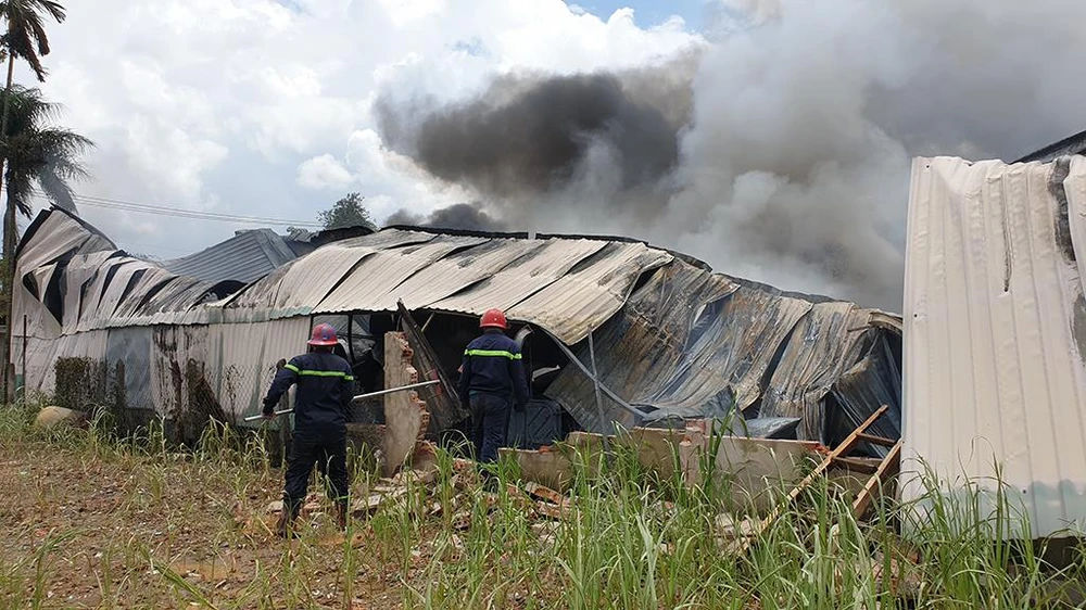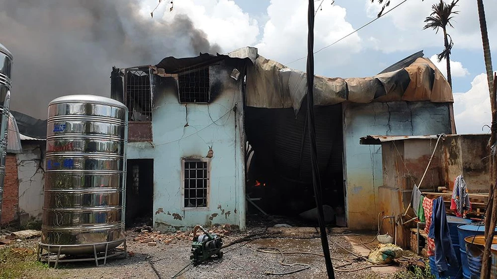 Đến đầu giờ chiều 22-8, lực lượng chức năng huyện Hóc Môn, TP.HCM vẫn đang phong tỏa hiện trường, dập lửa tàn ở khu vực vụ cháy trên địa bàn xã Nhị Bình khiến cả trăm mét vuông nhà xưởng bị thiêu rụi.