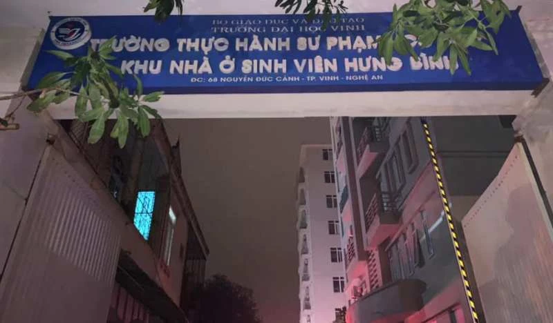 Khuya 11-2, lửa bất ngờ bốc lên từ phòng kỹ thuật tầng 5 của Khu nhà ở sinh viên Hưng Bình (thuộc Trường ĐH Vinh) tại số 68 đường Nguyễn Đức Cảnh (phường Hưng Bình, TP Vinh).