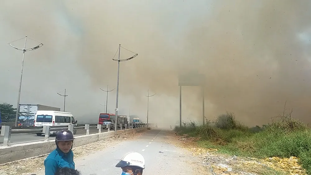 Đám cháy cỏ bùng phát, tỏa khói mù mịt ở tiết trời khô nóng khiến các phương tiện giao thông gặp khó khăn khi di chuyển. Ảnh: HT