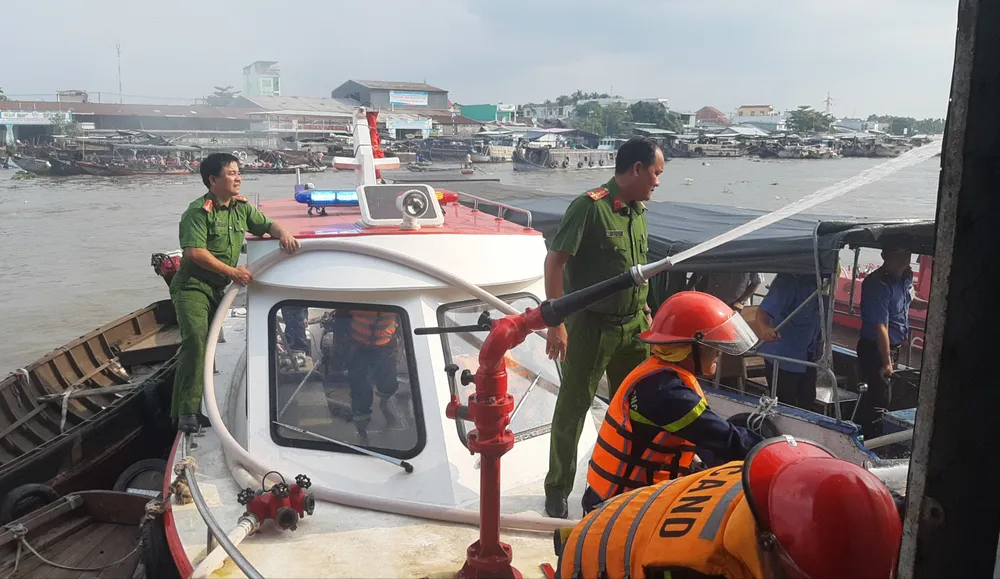 Không chỉ xe chữa cháy mà phương tiện chữa cháy đường sông cũng được điều động đến phục vụ công tác cứu hỏa. Sau khoảng 30 phút, hỏa hoạn đã được khống chế. Chủ cơ sở bị bỏng nhẹ, được đưa đi cấp cứu.