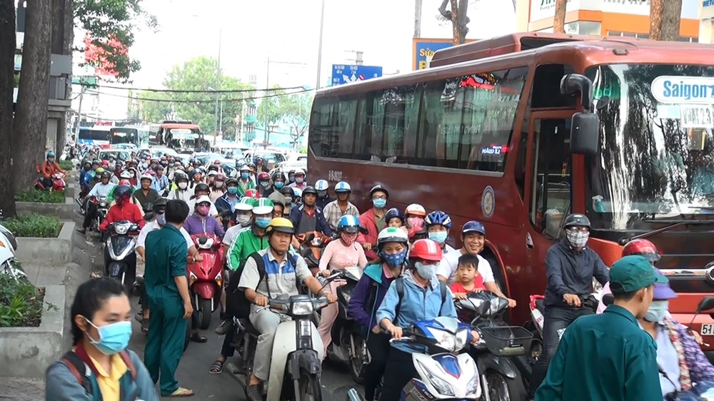Vụ cháy khiến giao thông qua khu vực ùn ứ nghiêm trọng. Ảnh: H.Tâm