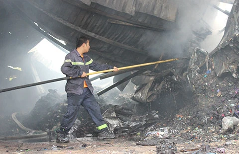 Nhận tin báo, lực lượng PCCC đã điều năm xe chữa cháy tới hiện trường. Nhiều bao tải chứa vải được nhanh chóng mang ra bên ngoài, cùng lúc xe máy múc cũng được huy động… Lửa được khống chế sau đó nhưng kho phế liệu cũng bị cháy rụi. Nguyên nhân ban đầu là do hàn điện cạnh kho phế liệu.