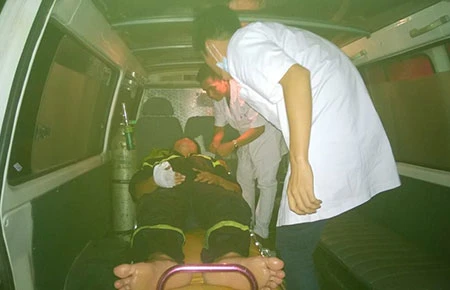 Lính cứu hỏa đang được cấp cứu. Ảnh: XUÂN NGỌC
