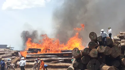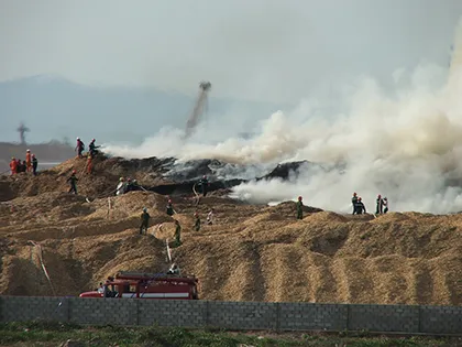 Theo ghi nhận của CTV PLO, ở bãi gỗ tròn hàng ngàn cây gỗ đã trở thành những đống than đỏ rực. Do không khống chế được nên hiện đám cháy đang lan mạnh sang bãi chứa gỗ dăm bên cạnh.