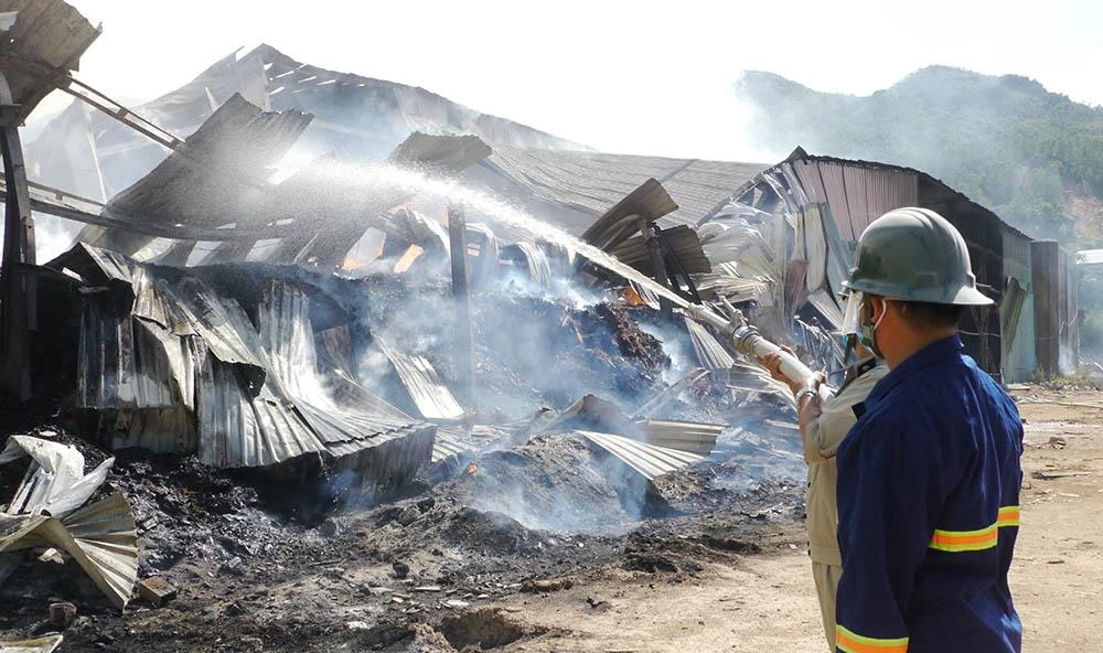 Đến 18 giờ chiều 12-8, các lực lượng chữa cháy tỉnh Bình Định vẫn nỗ lực dập đám cháy xảy ra tại kho dăm gỗ, viên nén sinh học của Công ty CP Năng lượng sinh học Phú Tài trong Khu công nghiệp Phú Tài ở TP Quy Nhơn (Bình Định).