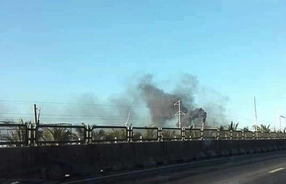 Đứng cách xa hiện trường hàng km nhưng vẫn thấy rõ cột khói đen ngòm bốc lên từ vụ cháy. Ảnh: KHÁNH NGUYỄN