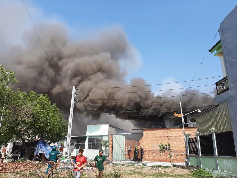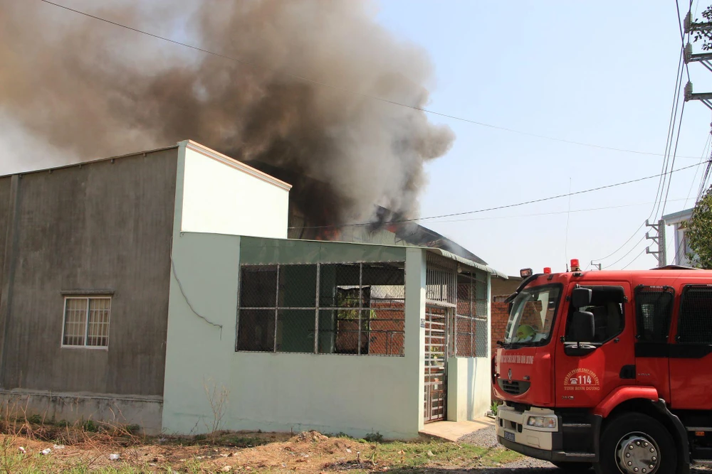 Đến khoảng 10 giờ ngày 26-3, lửa vẫn đang bốc lên dữ dội tại một công ty chuyên sản xuất đồ gỗ rộng hàng ngàn mét vuông ở phường Thuận Giao, thị xã Thuận An, Bình Dương.